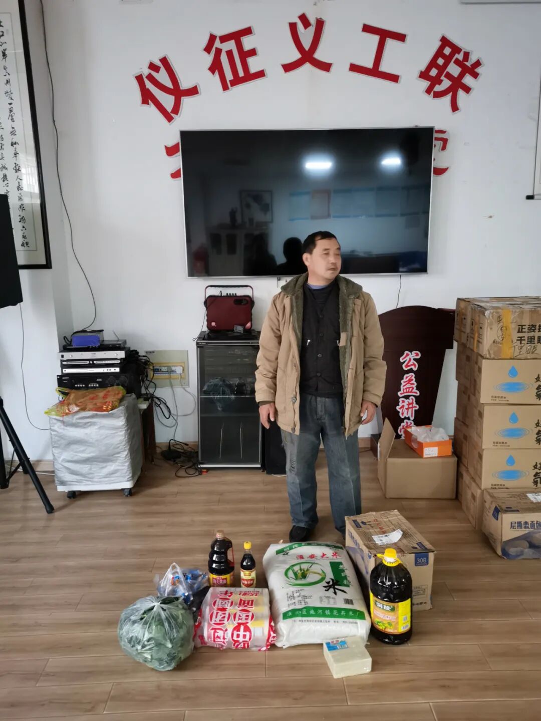 特困户李先生上门求助,他是残疾人,大腿以下是假肢,左眼失明,找不到工作,仅靠开一个电三轮带客,听他说昨天才赚了11块钱,有时候一天都没有生意,房租已经欠了几个月了,我建议他去农行那里找搬运的活,他很难过的说,因为他是残疾人,人家都不要他,他只能开一个电三轮带客,他还说义工联以后有需要他的地方尽管打电话给他,我让他把户口赶紧迁到仪征来,不然低保都办不下来,他说可能办不了,因为他没有房子,是租的房子,我也不清楚像他这种情况能不能办低保?今天把李伟捐赠的大米挂面和爱心人士捐的油和肥皂给他了,又给了一箱面包,我也拿了我买的榨菜和酱油,醋给他回去好过年,给他500元济困金,由文峰慈善基金会赞助.