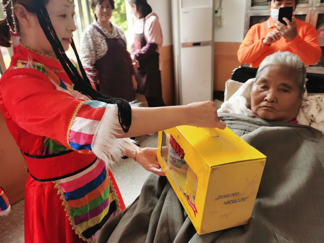 虹桥社区开心艺术团给失能老人送上奶粉一盒,并且给老人们买了手撕面包