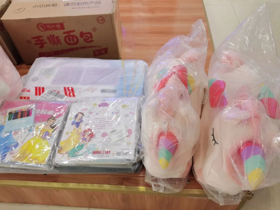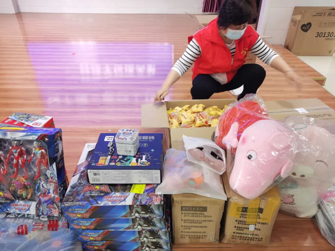 义工们在做发微心愿前的准备工作,为方便发放,把礼品的包装提前拿掉