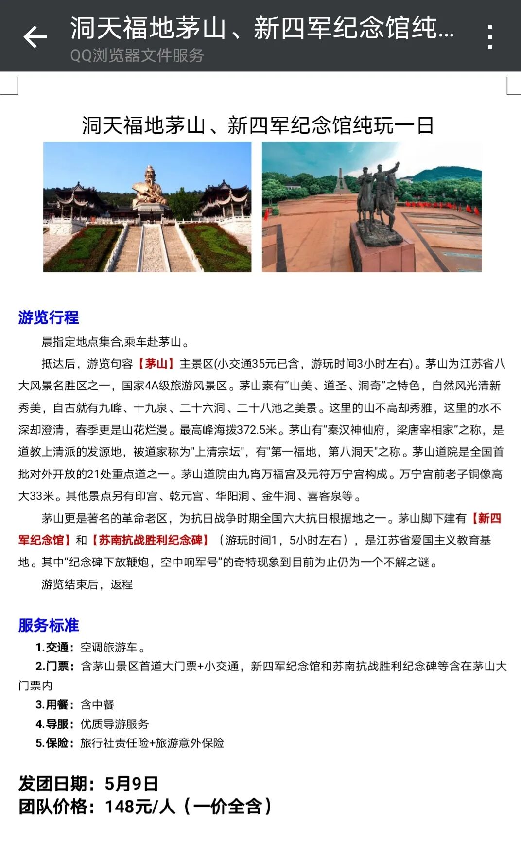 5月9日(周日)洞天福地茅山,新四军纪念馆纯玩一日游148元(含车费(35元),门票(团体票),景交(35元),午餐(30元),保险),即日起开始报名,以收费为准,请大家报姓名,身份证号,电话号码,注明在化纤上车还是仪征上车,春天来了,让我们一起出去呼吸新鲜空气吧!
